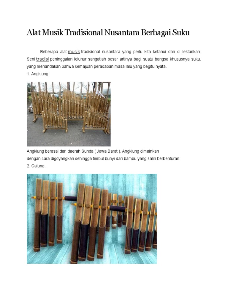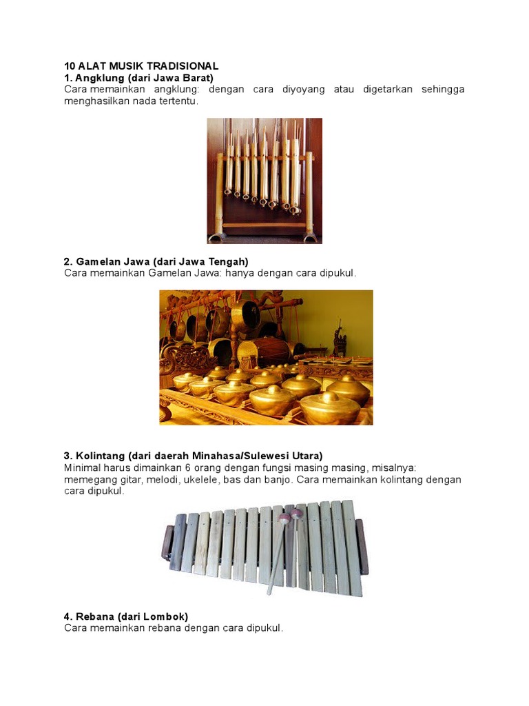 Sasando adalah salah satu alat musik tradisional dari pulau rote, nusa tenggara timur (ntt). Dahulu, genggong berguna sebagai pelipur kebosanan para petani ketika sedang beristirahat. Alat musik serunai dimainkan dengan cara ditiup lalu diatur nadanya dengan cara memainkan cari tengah, alat musik ini berasal dari nusa tenggara barat. Dikutip dari kbbi, sasando adalah alat musik petik dari pulau rote yang terdiri atas tabung bambu dengan rentangan beberapa dawai yang ditempatkan pada ruang resonansi yang terbuat dari daun lontar. Cara memainkan alat musik ini juga pastinya beda dan sedikit rumit dibandingkan gitar. Sasando merupakan alat musik dawai yang bisa dimainkan dengan cara dipetik. Cara memainkan alat musik rebab adalah dengan cara digesek menggunakan alat gesek di bagian senarnya. Alat musik ini terbuat dari bambu sebagai bagian utama dengan bantalan kayu yang berbentuk melingkar dari bagian bawah sampai bagian atas untuk penyangga senar. Salah satu alat musik tradisional daerah yang cukup terkenal ialah sasando. Namun, hanya bentukannya saja yang tidak mirip dengan gitar. Alat musik gambang terbuat dari delapan belas (18) bilah bambu. Alat musik sasando merupakan alat musik dawai yang dimainkan dengan dipetik. Rabu, 20 januari 2021 09:45 wib.